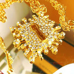 The Designer Keyhole Necklace brings all the drama right where it belongs: at the neckline. With a radiant crystal-covered pendant and a bold keyhole center, it feels suggestive, seductive, and just polished enough to get away with it.